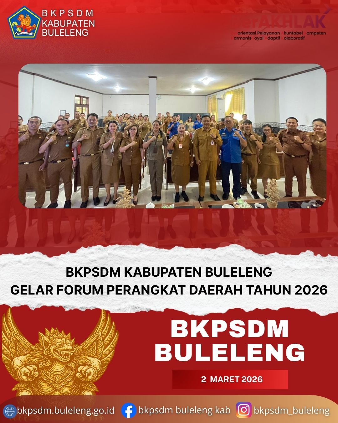 Buleleng, 2 Maret 2026 - Badan Kepegawaian dan Pengembangan Sumber Daya Manusia (BKPSDM) Kabupaten Buleleng melaksanakan Forum Perangkat Daerah Tahun 2026 sebagai bagian dari tahapan penyusunan Rencana Kerja Perangkat Daerah (Renja) Tahun 2027.