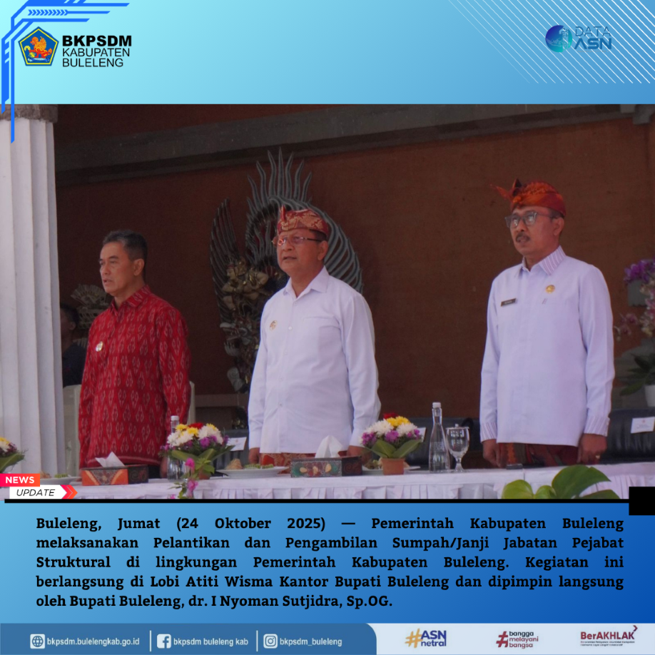 Buleleng, Jumat (24 Oktober 2025) — Pemerintah Kabupaten Buleleng melaksanakan Pelantikan dan Pengambilan Sumpah/Janji Jabatan Pejabat Struktural di lingkungan Pemerintah Kabupaten Buleleng. Kegiatan ini berlangsung di Lobi Atiti Wisma Kantor Bupati Buleleng dan dipimpin langsung oleh Bupati Buleleng, dr. I Nyoman Sutjidra, Sp.OG.