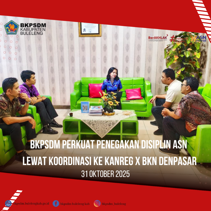 Denpasar, 31 Oktober 2025 — Dalam upaya memperkuat tata kelola kepegawaian yang profesional dan berbasis regulasi, Badan Kepegawaian dan Pengembangan Sumber Daya Manusia (BKPSDM) Kabupaten Buleleng melaksanakan kegiatan koordinasi dengan Kantor Regional X Badan Kepegawaian Negara (BKN) Denpasar, Jumat (31/10).