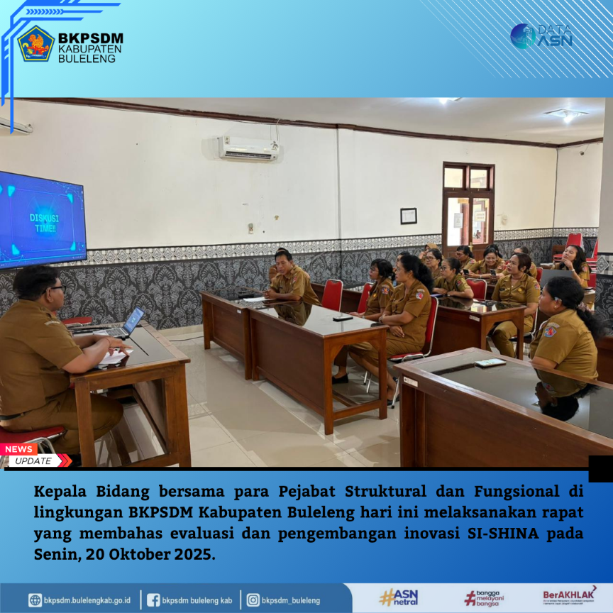 Kepala Bidang bersama para Pejabat Struktural dan Fungsional di lingkungan BKPSDM Kabupaten Buleleng hari ini melaksanakan rapat yang membahas evaluasi dan pengembangan inovasi SI-SHINA pada Senin, 20 Oktober 2025.