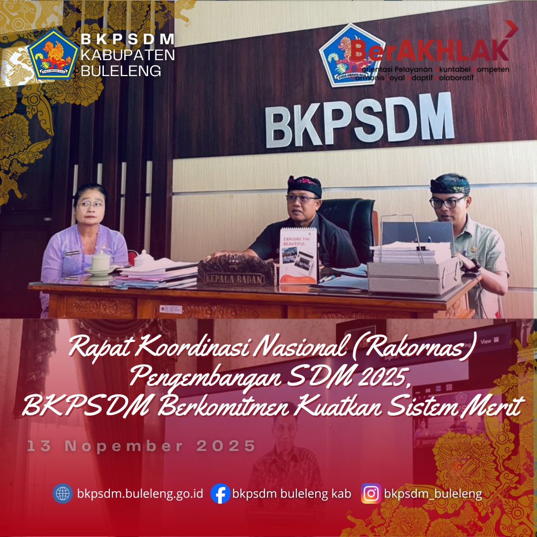 Buleleng, 13 November 2025 - Badan Kepegawaian dan Pengembangan Sumber Daya Manusia (BKPSDM) Kabupaten Buleleng mengikuti Rapat Koordinasi Nasional (Rakornas) Pengembangan Sumber Daya Manusia Tahun 2025 yang diselenggarakan oleh Badan Pengembangan Sumber Daya Manusia (BPSDM) Kementerian Dalam Negeri secara daring, Kamis (13/11).