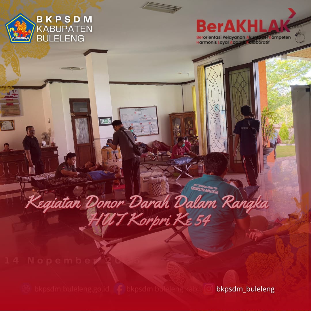 Buleleng, 14 November 2025 - Memperingati Hari Ulang Tahun (HUT) Korps Pegawai Republik Indonesia (KORPRI) ke-54 tahun 2025, KORPRI Kabupaten Buleleng menyelenggarakan kegiatan Donor Darah pada Jumat, 14 November 2025 di halaman kantor Badan Kepegawaian dan Pengembangan Sumber Daya Manusia (BKPSDM) Kabupaten Buleleng.