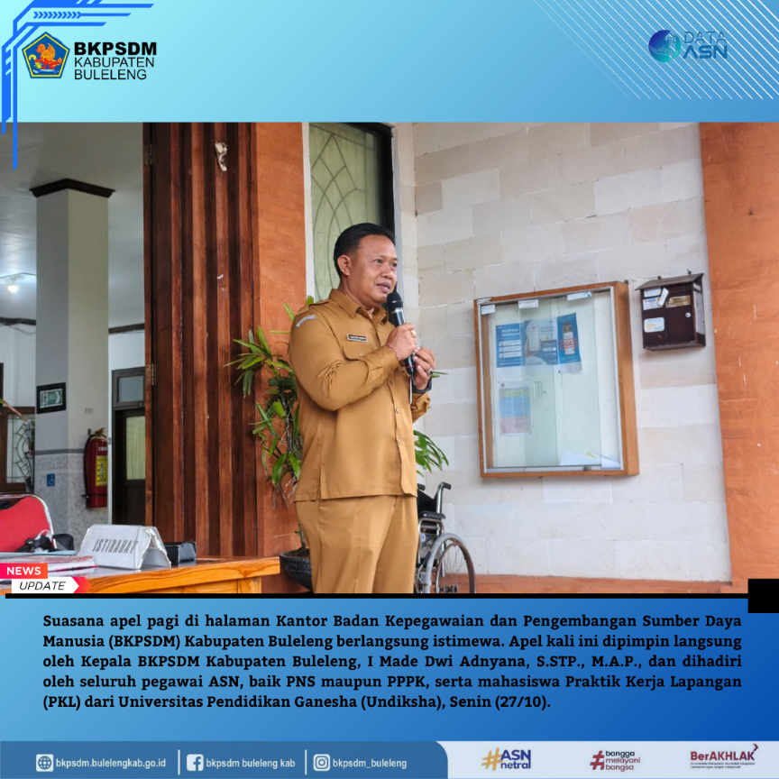 Suasana apel pagi di halaman Kantor Badan Kepegawaian dan Pengembangan Sumber Daya Manusia (BKPSDM) Kabupaten Buleleng berlangsung istimewa. Apel kali ini dipimpin langsung oleh Kepala BKPSDM Kabupaten Buleleng, I Made Dwi Adnyana, S.STP., M.A.P., dan dihadiri oleh seluruh pegawai ASN, baik PNS maupun PPPK, serta mahasiswa Praktik Kerja Lapangan (PKL) dari Universitas Pendidikan Ganesha (Undiksha), Senin (27/10).