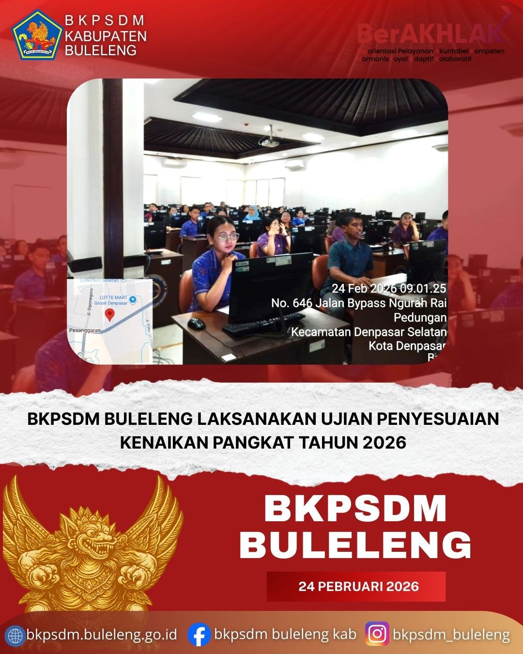 Singaraja, 24 Februari 2026 - BKPSDM Kabupaten Buleleng melaksanakan Ujian Penyesuaian Kenaikan Pangkat (UPKP) Tahun 2026 bagi Aparatur Sipil Negara di lingkungan Pemerintah Kabupaten Buleleng. Kegiatan ini difasilitasi oleh Kantor Regional X BKN Denpasar terkait pelaksanaan Ujian Dinas dan Ujian Penyesuaian Kenaikan Pangkat Tahun 2026.