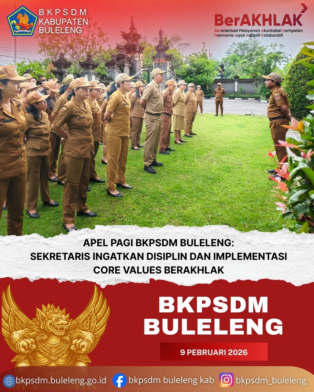 BKPSDM Kabupaten Buleleng melaksanakan apel pagi pada Senin, 9 Februari 2026, bertempat di halaman kantor BKPSDM. Apel dipimpin oleh Sekretaris BKPSDM, Made Herry Hermawan, S.STP., M.A.P, dan diikuti oleh seluruh pegawai ASN di lingkungan BKPSDM Kabupaten Buleleng.
