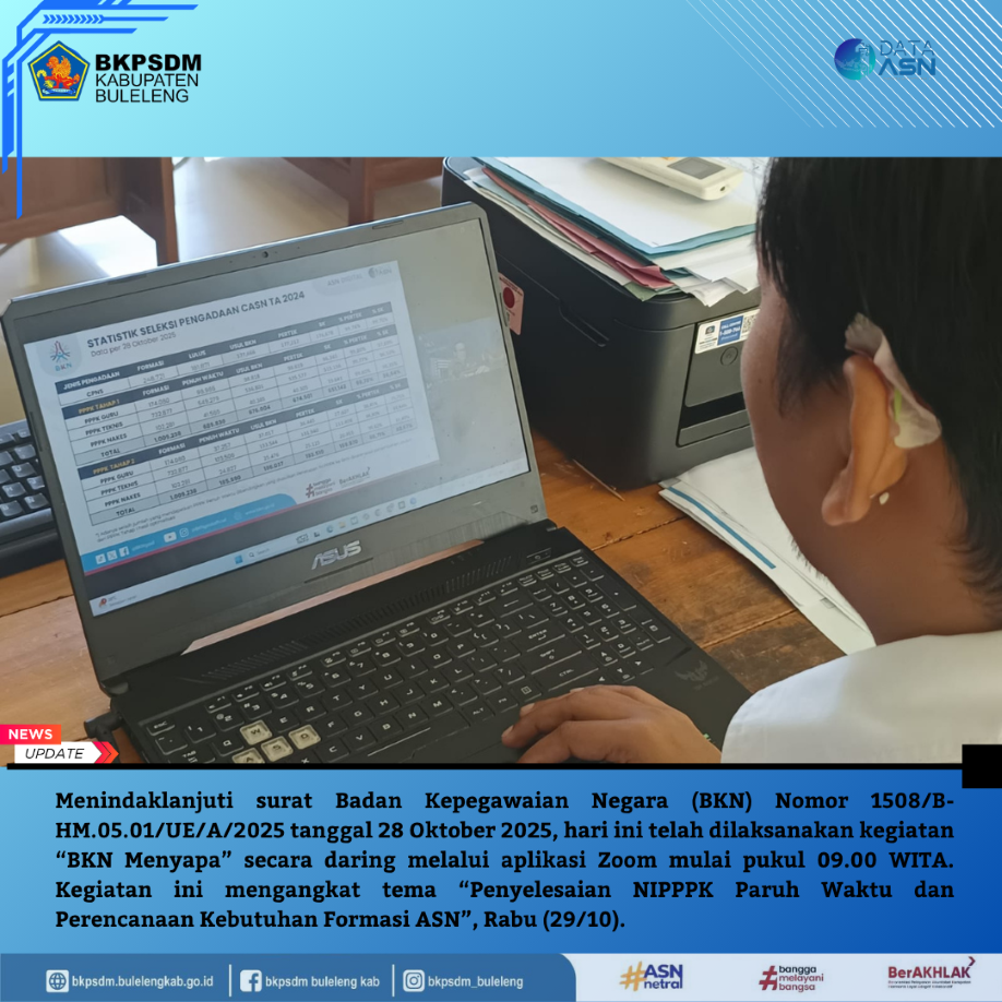 Menindaklanjuti surat Badan Kepegawaian Negara (BKN) Nomor 1508/B-HM.05.01/UE/A/2025 tanggal 28 Oktober 2025, hari ini telah dilaksanakan kegiatan “BKN Menyapa” secara daring melalui aplikasi Zoom mulai pukul 09.00 WITA. Kegiatan ini mengangkat tema “Penyelesaian NIPPPK Paruh Waktu dan Perencanaan Kebutuhan Formasi ASN”.
