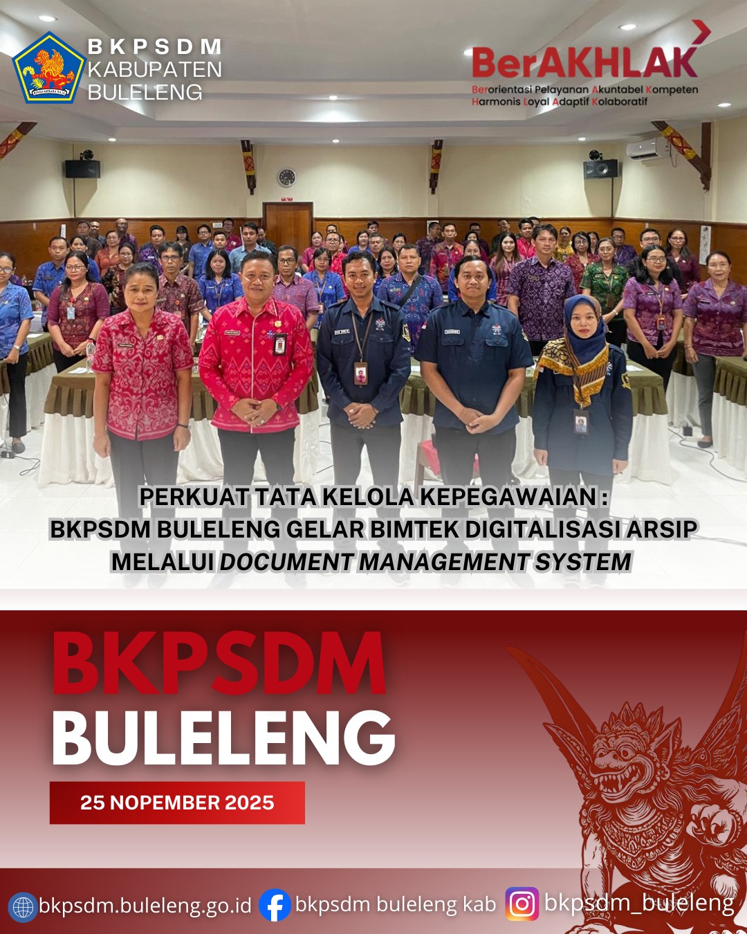 Buleleng, 25 November 2025 - Badan Kepegawaian dan Pengembangan Sumber Daya Manusia (BKPSDM) Kabupaten Buleleng menyelenggarakan Bimbingan Teknis (Bimtek) Digitalisasi Arsip Kepegawaian melalui penerapan Document Management System (DMS) bagi pengelola kepegawaian di lingkungan Pemerintah Kabupaten Buleleng. Kegiatan berlangsung di Hotel Aneka Lovina Villas & Spa, Lovina mulai pukul 07.30 WITA.