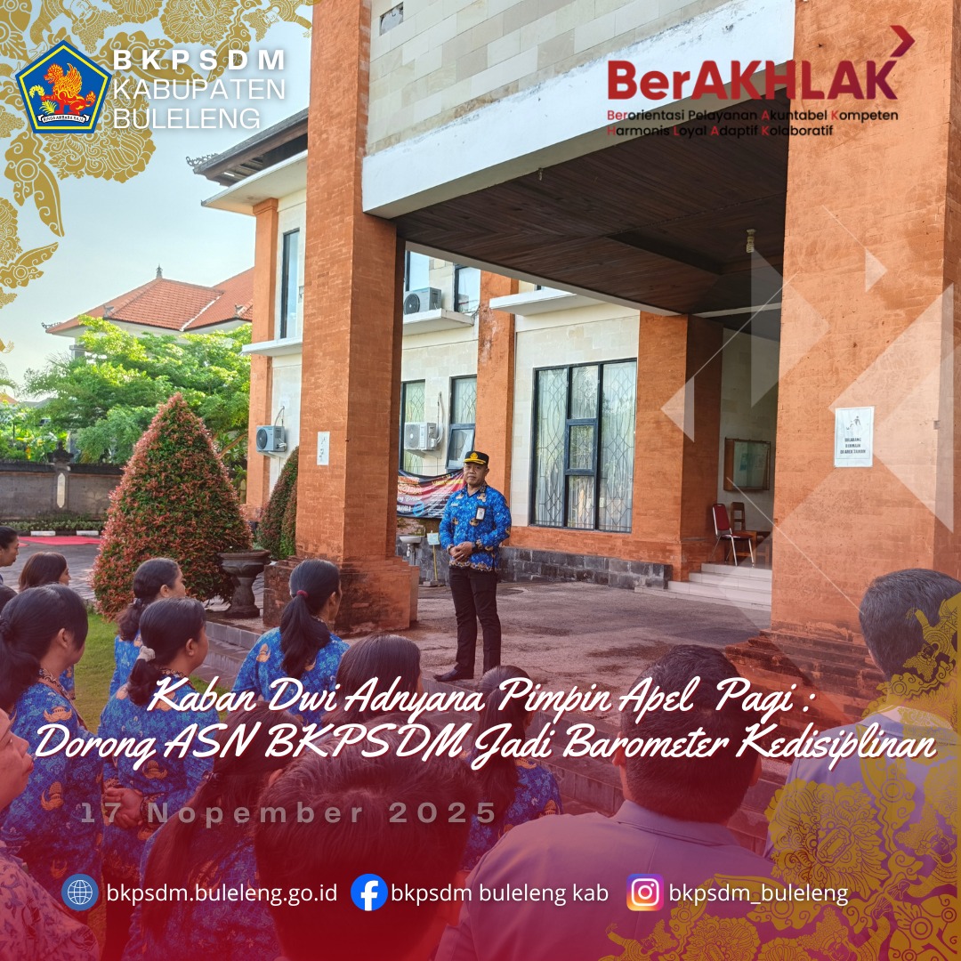 Buleleng, 17 November 2025 --- Badan Kepegawaian dan Pengembangan Sumber Daya Manusia (BKPSDM) Kabupaten Buleleng melaksanakan apel pagi yang dipimpin oleh Kepala BKPSDM, I Made Dwi Adnyana, S.STP., M.A.P. Kegiatan berlangsung di halaman kantor BKPSDM dan diikuti oleh seluruh pegawai.