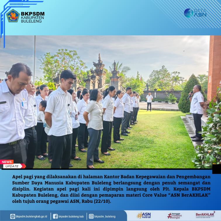 Apel pagi yang dilaksanakan di halaman Kantor Badan Kepegawaian dan Pengembangan Sumber Daya Manusia (BKPSDM) Kabupaten Buleleng berlangsung dengan penuh semangat dan disiplin. Kegiatan apel pagi kali ini dipimpin langsung oleh Plt. Kepala BKPSDM Kabupaten Buleleng, dan diisi dengan pemaparan materi Core Value ASN “BerAKHLAK” oleh tujuh orang pegawai ASN pada Rabu, 20 Oktober 2025