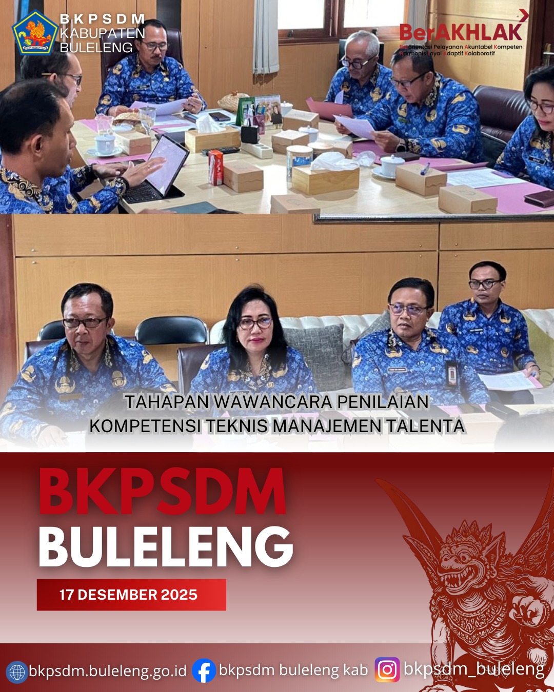 Buleleng, 17 Desember 2025 - Pemerintah Kabupaten Buleleng melalui Badan Kepegawaian dan Pengembangan Sumber Daya Manusia (BKPSDM) melaksanakan tahapan Wawancara Kompetensi Teknis melalui Manajemen Talenta ASN. Kegiatan ini merupakan bagian dari upaya penguatan sistem merit dan pengembangan karier aparatur sipil negara (ASN) di lingkungan Pemerintah Kabupaten Buleleng.