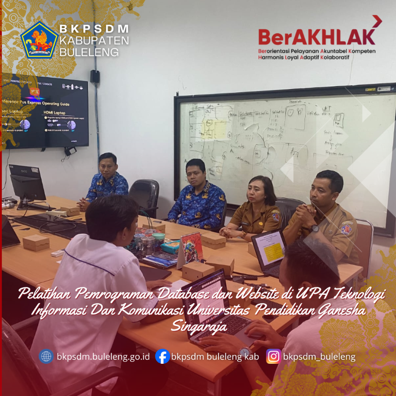 Pelatihan yang diselenggarakan pada 10–14 November 2025 diisi oleh Tim TIK Undiksha, antara lain I Nyoman Laba Jayanta S.Pd., M.Pd., Made Yuda Sadewa, S.Pd., M.Kom., dan Made Agus Panji Sujaya, S.Pd., M.Kom. Kegiatan ini bertujuan meningkatkan kemampuan, pengetahuan, dan keterampilan aparatur dalam bidang pemrograman database serta pengembangan website, khususnya bagi pengelola sistem informasi kepegawaian di lingkungan BKPSDM Kabupaten Buleleng.