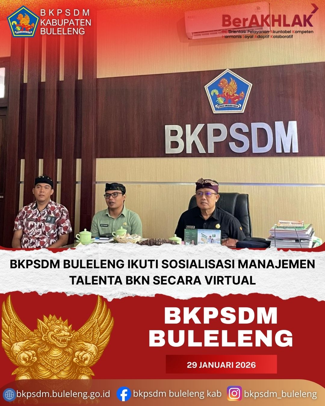 Buleleng - Badan Kepegawaian dan Pengembangan Sumber Daya Manusia (BKPSDM) Kabupaten Buleleng mengikuti kegiatan Sosialisasi Dukungan Data Hasil Penilaian Potensi dan Kompetensi terhadap Akselerasi Penerapan Manajemen Talenta yang diselenggarakan oleh Kantor Regional X Badan Kepegawaian Negara (BKN) Denpasar. Kegiatan ini dilaksanakan secara daring melalui Zoom Meeting pada Kamis, 29 Januari 2026.