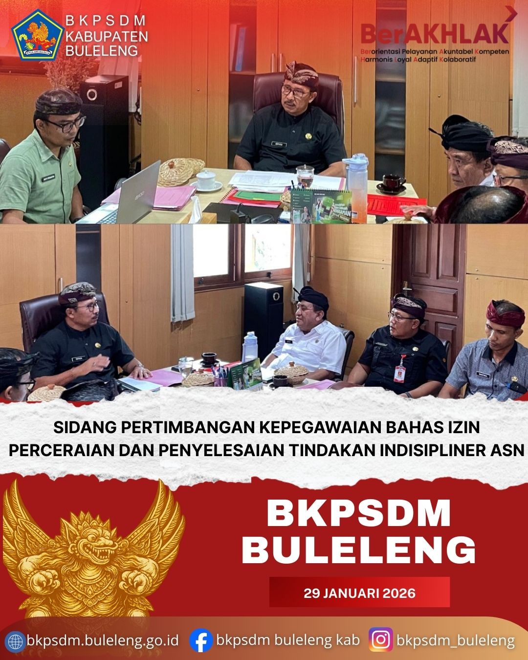 Buleleng, 29 Januari 2026 - Pemerintah Kabupaten Buleleng melaksanakan Sidang Pertimbangan Kepegawaian pada Kamis, 29 Januari 2026, bertempat di Ruang Rapat Sekretaris Daerah Kabupaten Buleleng. Sidang ini merupakan bagian dari mekanisme pembinaan, pengawasan, dan penegakan disiplin Aparatur Sipil Negara (ASN).