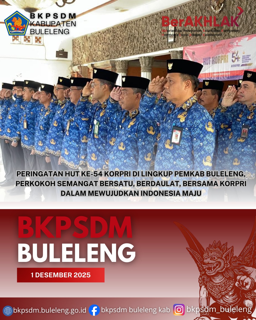 Buleleng, 1 Desember 2025 - Pemerintah Kabupaten Buleleng menyelenggarakan Apel Peringatan HUT Ke-54 KORPRI di halaman Kantor Bupati Buleleng. Apel ini diikuti oleh Para Staf Ahli Bupati, Para Asisten Sekretariat Daerah, Kepala Perangkat Daerah, Para Kepala Bagian di lingkup Sekretariat Daerah, dan perwakilan Pegawai ASN di Pemerintah Kabupaten Buleleng. Hadir pula dalam apel ini, Kepala BKPSDM Kabupaten Buleleng, I Made Dwi Adnyana, S.STP., M.A.P, pejabat administrator, pengawas dan staf.