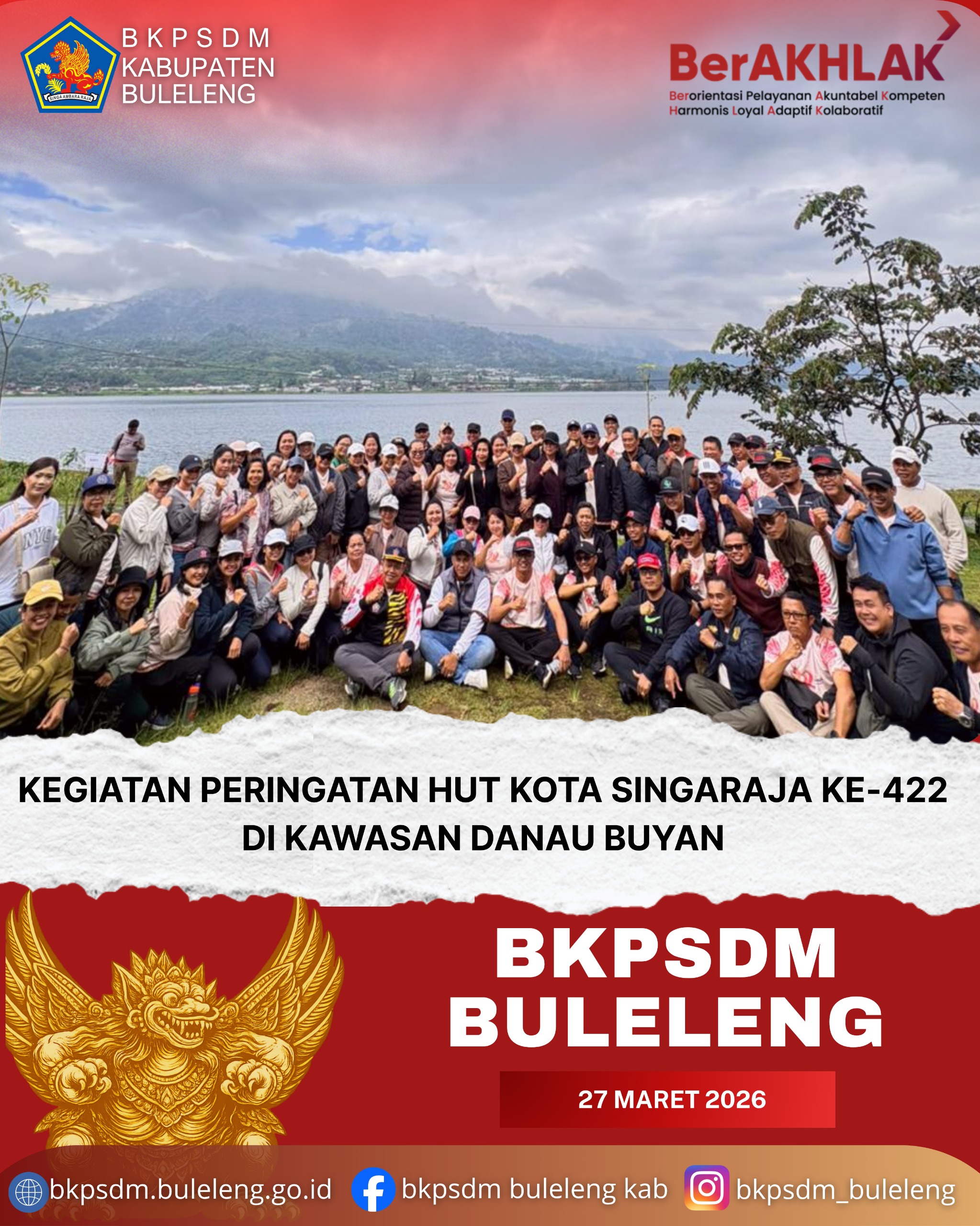 Buleleng, 27 Maret 2026 - Dalam rangka memperingati Hari Ulang Tahun Kota Singaraja, Pemerintah Kabupaten Buleleng melaksanakan rangkaian kegiatan di kawasan Danau Buyan pada Jumat (27/3/2026).