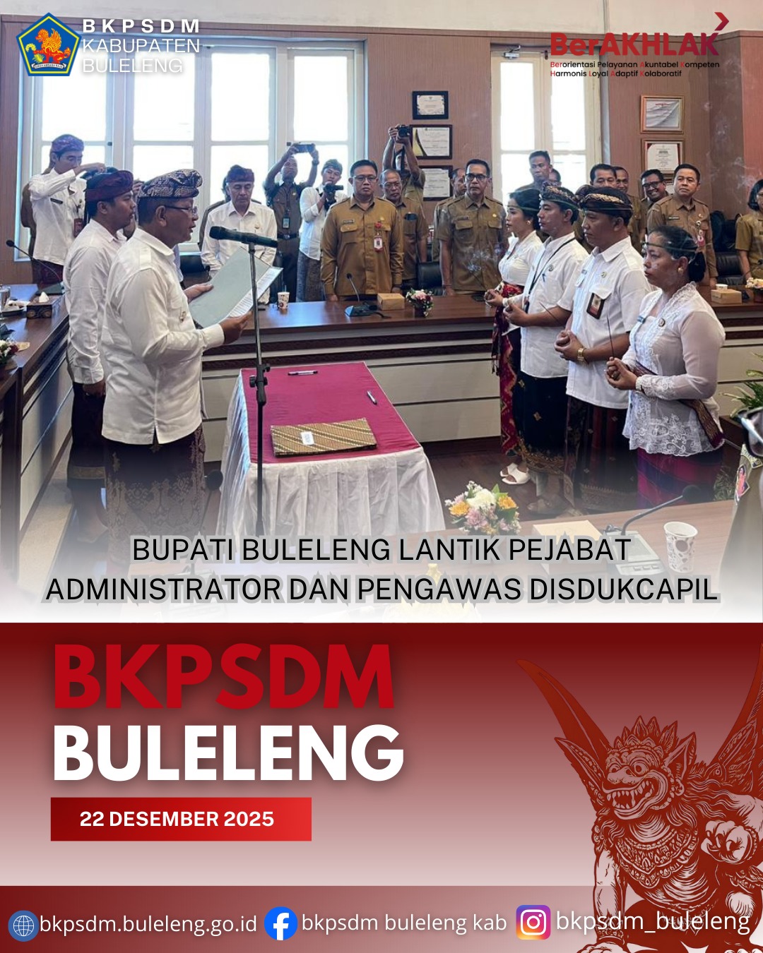 Buleleng, 22 Desember 2025 - Pemerintah Kabupaten Buleleng menyelenggarakan Pelantikan dan Pengambilan Sumpah/Janji Pejabat Administrator dan Pejabat Pengawas di lingkungan Dinas Kependudukan dan Pencatatan Sipil Kabupaten Buleleng, bertempat di Kantor Bupati Buleleng, Senin (22/12/2025). Pelantikan dipimpin langsung oleh Bupati Buleleng.