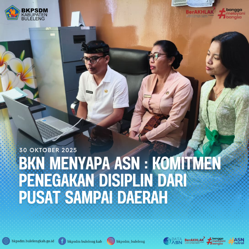 Dalam rangka meningkatkan pemahaman dan penegakan kedisiplinan di kalangan Aparatur Sipil Negara (ASN), Badan Kepegawaian Negara (BKN) kembali menyelenggarakan kegiatan BKN Menyapa ASN dengan tema “Disiplin ASN”, secara daring melalui aplikasi Zoom Meeting pada Kamis, 30 Oktober 2025