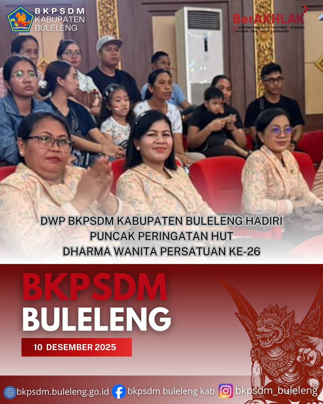 Singaraja, 10 Desember 2025 - Dharma Wanita Persatuan (DWP) Kabupaten Buleleng menyelenggarakan Puncak Peringatan HUT DWP ke-26 dengan tema “Peran Strategis Dharma Wanita Persatuan dalam Pendidikan Anak Bangsa untuk Indonesia Emas 2045”. Kegiatan berlangsung di Gedung Kesenian Gde Manik Singaraja dan diikuti oleh unsur DWP dari perangkat daerah dan kecamatan se-Kabupaten Buleleng.