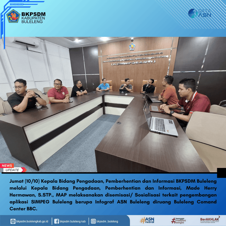 Kepala Bidang Pengadaan, Pemberhentian dan Informasi BKPSDM Buleleng melalui Kepala Bidang Pengadaan, Pemberhentian dan Informasi, Made Herry Hermawan, S.STP., MAP melaksanakan disemisasi/Sosialisasi terkait pengembangan aplikasi SIMPEG Buleleng berupa Infograf ASN Buleleng diruang Buleleng Comand Center BBC. Kegiatan ini dihadiri oleh Kepala Dinas Komunikasi,Informatika, Persandian dan Statistik Bapak Ketut Suwarmawan, S.STP., MM, hadir Juga Sekretaris Kepala Dinas Komunikasi,Informatika, Persandian dan Statistik berserta tim IT. Infograf Asn Buleleng (Peta Jalan SDM untuk Potensi Daerah Maksimal)merupakan terobosan digital berbasis infografis interaktif yang menyajikan data distribusi, kualifikasi, dan kompetensi ASN per wilayah kecamatan, yang secara langsung dikaitkan dengan potensi unggulan daerah seperti pariwisata, pertanian, perikanan, pendidikan, dan kesehatan.