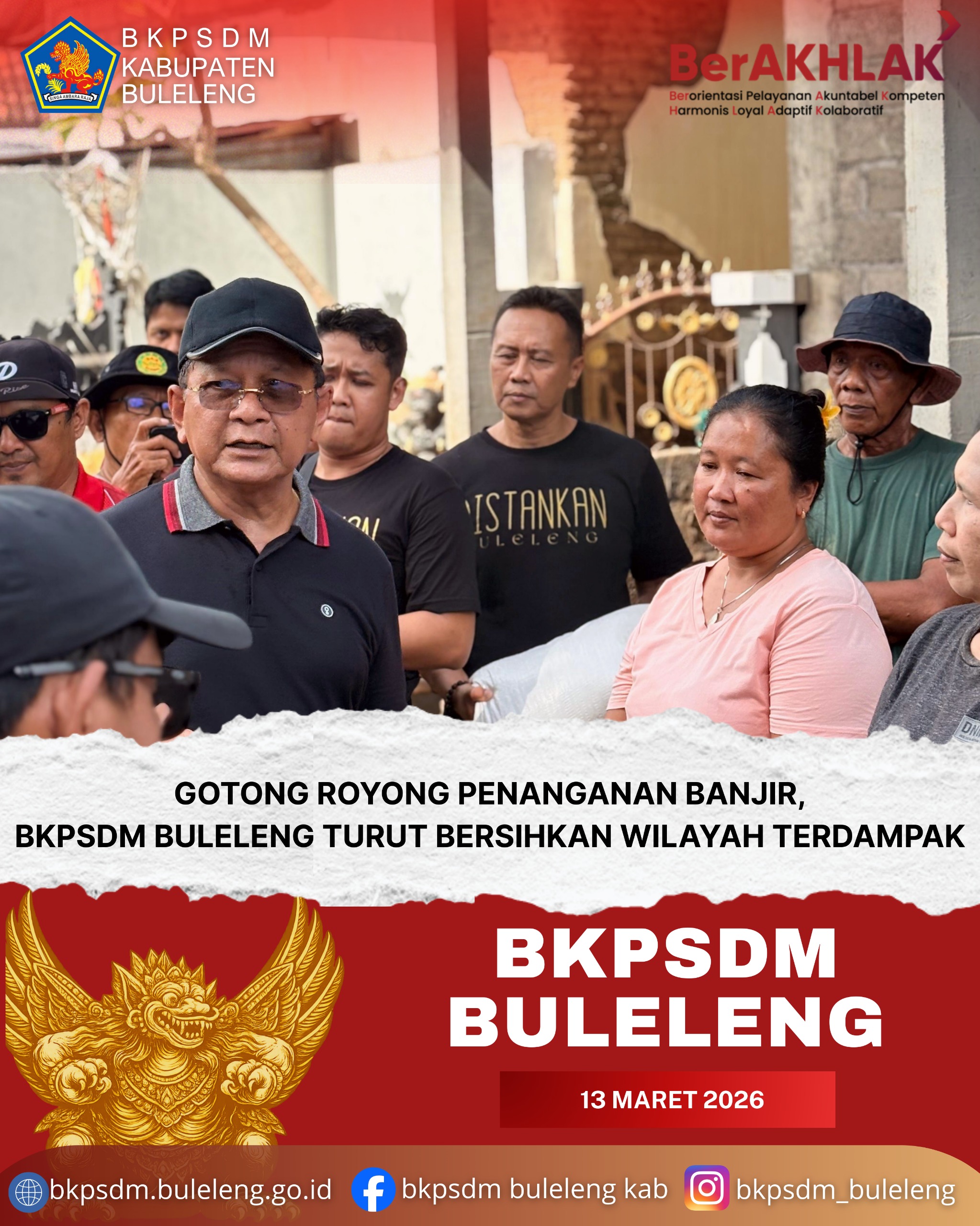 Badan Kepegawaian dan Pengembangan Sumber Daya Manusia (BKPSDM) Kabupaten Buleleng bersama sejumlah instansi lainnya melaksanakan kegiatan gotong royong di Banjar Sekar. Para peserta bekerja bersama membersihkan saluran air, mengangkat lumpur dan sampah yang terbawa arus banjir, serta menata kembali lingkungan sekitar permukiman warga.
