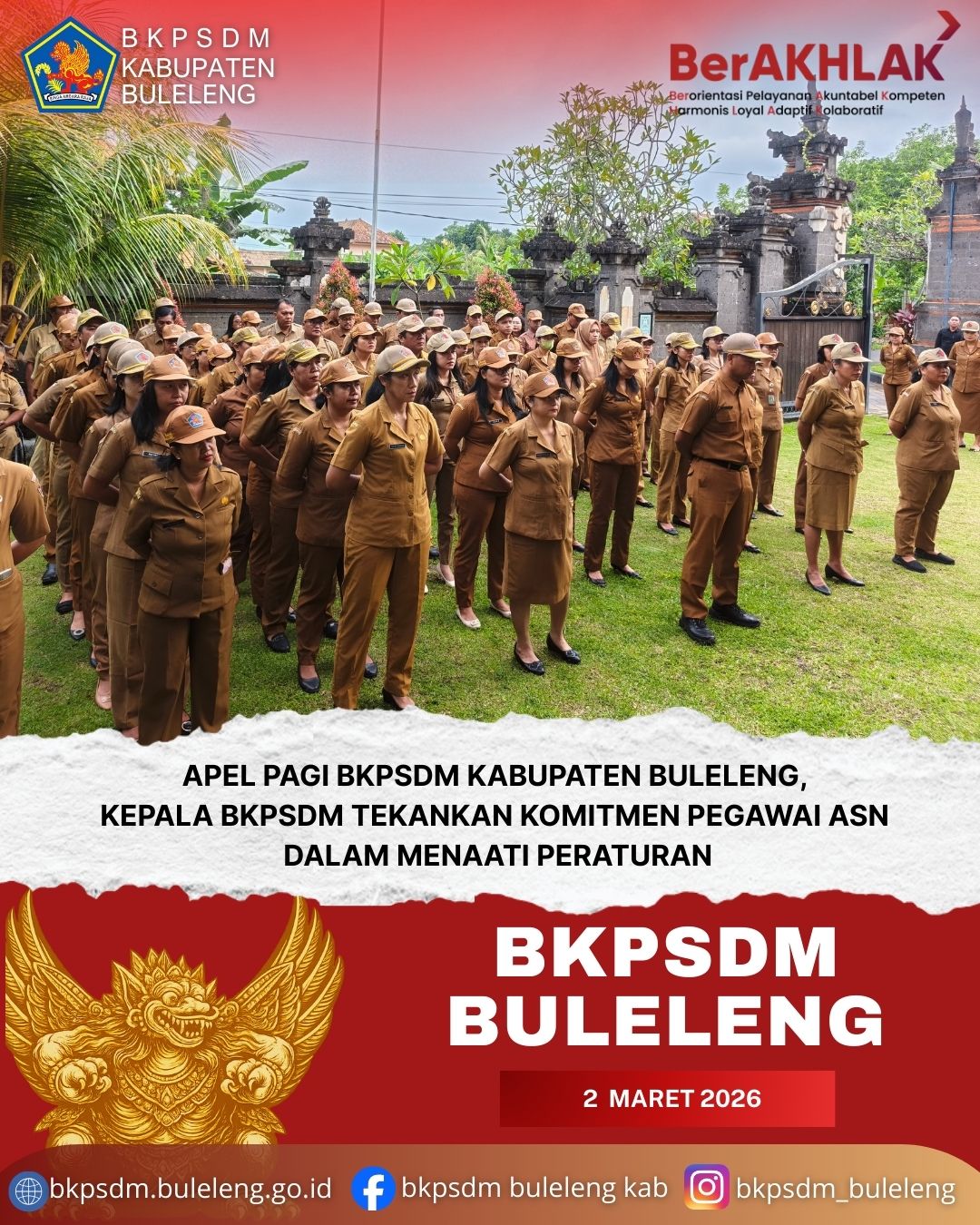 Senin, 2 Maret 2026, apel pagi di lingkungan BKPSDM Kabupaten Buleleng dipimpin langsung oleh Kepala BKPSDM Kabupaten Buleleng, I Made Dwi Adnyana, S.STP., M.A.P.